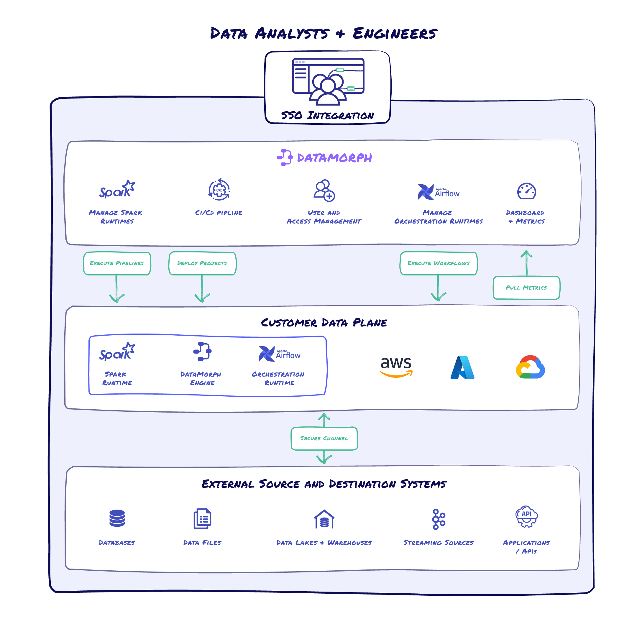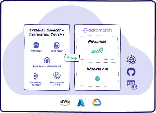 The data plane sits in your cloud environment, and DataMorph never has direct access to the data. The DataMorph engine and Spark and Orchestration runtimes are provisioned in your secure environment and manage the provisioning, scaling, and execution of data workflows and pipelines, as created in the control plane.